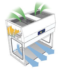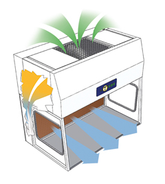 垂直凈化工作臺通常具有頂部或天花板安裝的過濾器。離開過濾介質的空氣從設備頂棚單向流動,然后穿過工作表面,從而將顆粒從外殼中掃出。