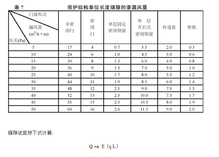 1 選用縫隙法來核算滲漏風(fēng)量,既思考了潔凈室圍護(hù)結(jié)構(gòu)的氣密性,又思考了室內(nèi)保持不一樣的壓差值所需的正壓風(fēng)量。因而,縫隙法比按房間的換氣次數(shù)預(yù)算法較為合理和準(zhǔn)確。 單位長度縫隙滲漏空氣量用公式核算是對(duì)比艱難的,一般是經(jīng)過不一樣型式的門、窗進(jìn)行屢次實(shí)驗(yàn)的數(shù)據(jù)核算后得出的。表 7是對(duì)G內(nèi)潔凈室的 20多種常用的門、窗在實(shí)驗(yàn)室進(jìn)行了很多的實(shí)驗(yàn),獲得的數(shù)據(jù),盡管這些年潔凈室門窗的資料和型式有很大的開展,但現(xiàn)在還有有些潔凈室依然選用鋼制密封門窗。故表中數(shù)據(jù)仍可供規(guī)劃時(shí)參閱。